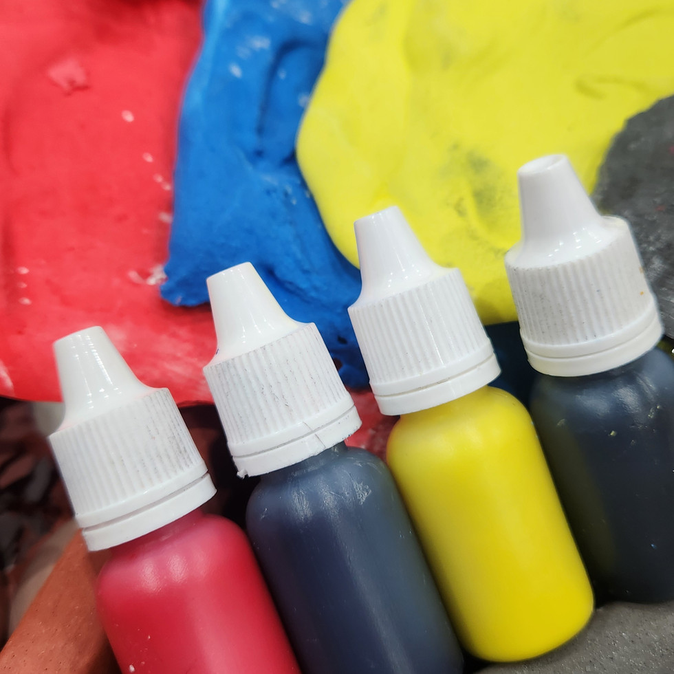 4 cores - Azul, Vermelho, Amarelo e Preto. Pigmentos líquidos. Frasco 30ml